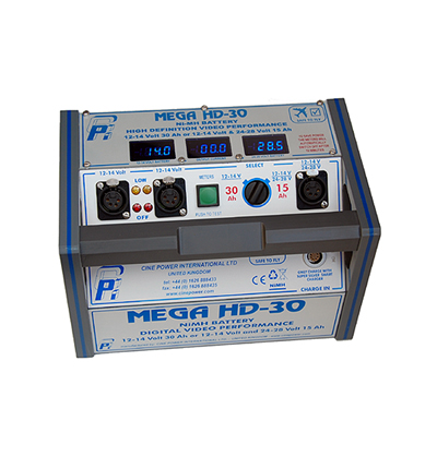 Indication All batteries are fitted with indicator LED's, multiple output digital voltage meters and total battery load current digital meter. Outputs Output voltages are selected with a switch and/or output cable. Live outputs are indicated by LED above the socket. Battery output can be disabled by switch ( excluding HD-30 ). Low Voltage: XLR: 14V High Voltage: LEMO: 14V + 24V is available through the LEMO socket simultaneously. (24V max load 5 Amps. Not available on HD-30) XLR: 14 and/or 28V ( depending on XLR socket fitted ) Other types of sockets can be fitted. Protection All batteries are fitted with internal self-resetting electronic fuses, thermal protection and over-discharge protection. The over-discharge protection device will cut all power to the output(s) once the battery has been discharged to the minimum safe level. A Yellow low battery warning LED will flash to give early warning that the cut-off point is close. A Red LED indicates that the battery is fully discharged, at which stage the load should be disconnected. The over-discharge protection function is totally automatic in operation, and will reset itself during subsequent recharge. Construction Fully sealed, suitable for air transport without restrictions. Battery housing machined from a high impact composite for rugged durability. Ultra low-loss design provides maximum power output, and gold plated low loss XLR and Fischer connectors fitted as standard. Recharging Mega HD / HD-30 requires Cine Power Super Silver Charger. HD-40 / HD-60 / Magnum-60 requires Cine Power Super Silver Mega Charger. Recharge time is proportional to the depth of discharge and ambient temperature. Typically no more than 5 hours from completely discharged. Colour and Finish Choice of colour: